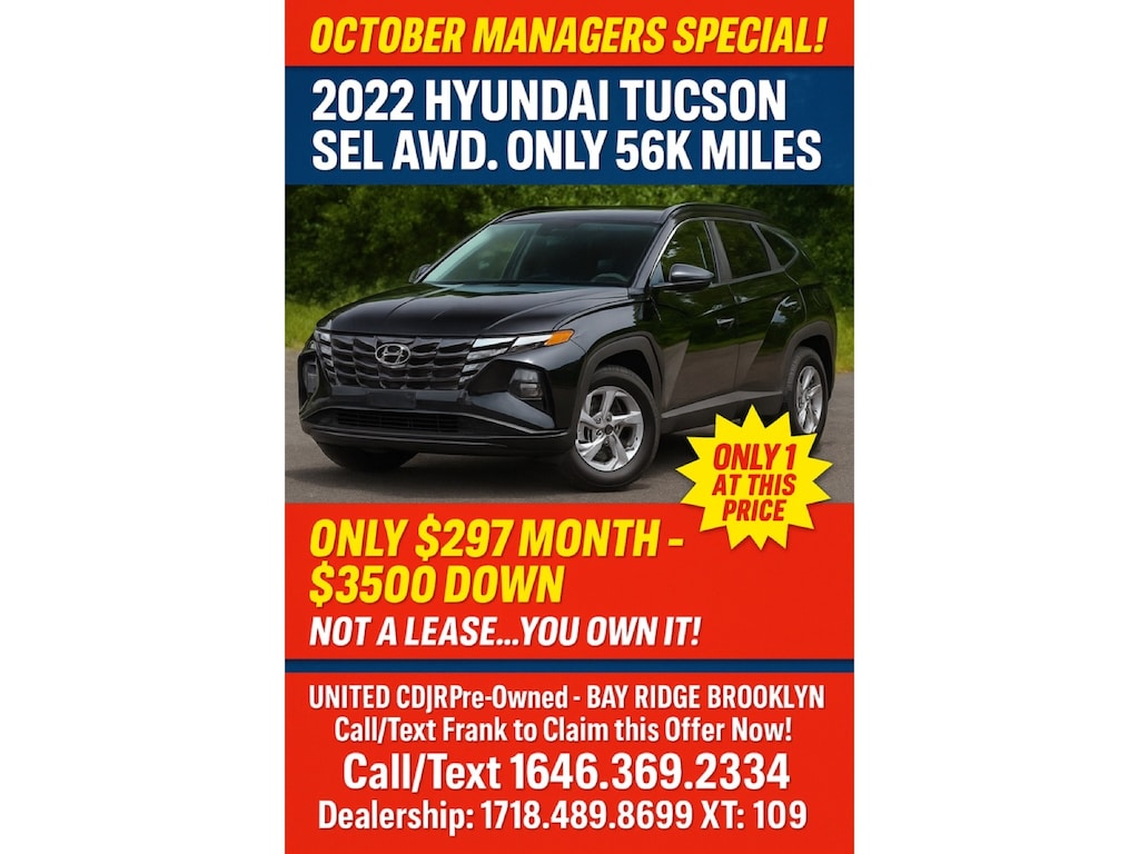 Visit our dealership at 8825 5th Ave in Brooklyn to buy or lease a vehicle, or head just down the street to the United Chrysler Dodge Jeep Ram service center at 111 58th St in Brooklyn for your next appointment. We cater to NYC Jeep drivers beyond the Bay Ridge neighborhood, so whether you're visiting from Staten Island, Manhattan, Queens, or across state lines in North Jersey , we hope to see you soon! Off-road or on the street, this Hyundai Tucson SEL handles with ease. Hit the gas pedal and put the engine power to all four wheels. With AWD, you'll have the greater performance right off the line, every time you drive. The look is unmistakably Hyundai, the smooth contours and cutting-edge technology of this Hyundai Tucson SEL will definitely turn heads. There is no reason why you shouldn't buy this Hyundai Tucson SEL. It is incomparable for the price and quality.
